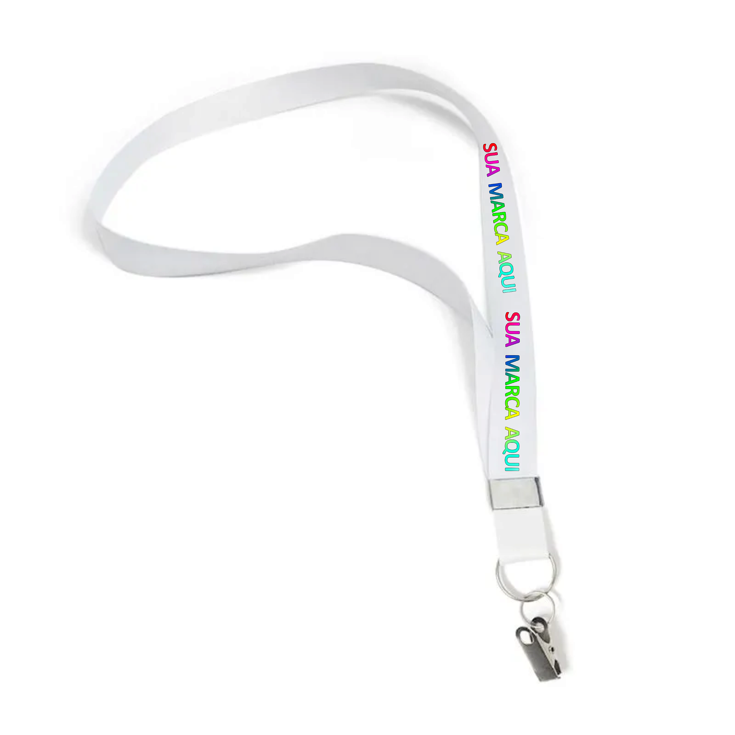 A personalização é realizada exclusivamente no lado externo do cordão, enquanto o lado interno mantém um acabamento liso e branco, conferindo um contraste discreto e elegante ao acessório. Essa configuração permite destacar logos, textos ou padrões de forma nítida e organizada na parte visível, tornando-o perfeito para promover uma marca, reforçar a identidade corporativa ou criar um acessório único. A largura de 20mm oferece espaço ideal para personalização sem comprometer a funcionalidade.